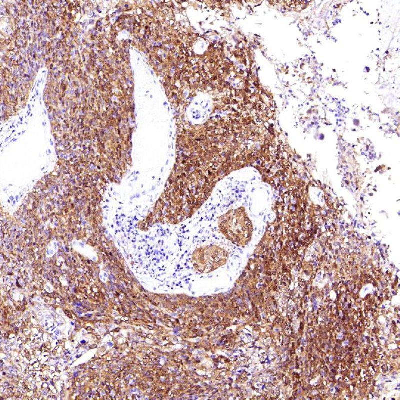 The p16 (p16INK4A) protein is a cyclin-dependent kinase (CDK) inhibitor that plays an important regulatory role in the cell cycle. By controlling the transition between the G1 and S phases through regulation of retinoblastoma protein, p16 decelerates cellular differentiation and therefore acts as a tumor suppressor, making it the key marker in several human cancers including head and neck cancer, perianal lesions, melanomas, gliomas, lymphomas, and some types of leukemia. p16 is also clinically indicated in carcinomas of the esophagus, pancreas, lung, biliary tract, liver, colon, and urinary bladder. Add the primary antibody to bind the antigen on tissue sections, and then use HRP labeled secondary antibody binding primary antibody to form the secondary antibody-primary antibody-antigen complex. When DAB chromogenic solution is added, HRP reacts with enzyme substrate to produce brown insoluble reaction product, which indirectly indicating the existence of antigen.